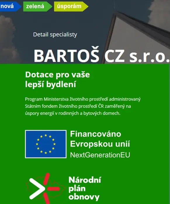 Je to jednoduché. Obrátit se totiž můžete na společnost BARTOŠ CZ, která je v tomto dotačním programu registrovaná. Stačí, když budete splňovat výše uvedené podmínky a firma vám pomůže s vyřízením a samozřejmě zařídí i celou instalaci. Podmínkou je, že vlastníci nebo spoluvlastníci rodinného domu jsou na místě trvale hlášeni od 12. září 2022.